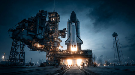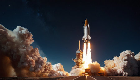 Space shuttle launch into space at night. Futuristic space exploration concept.