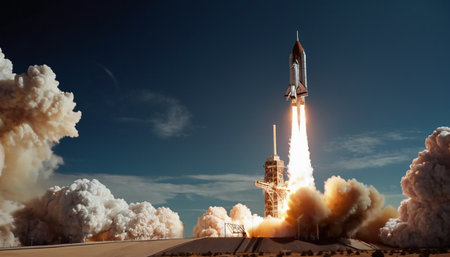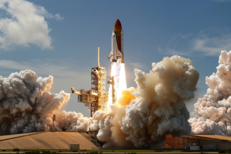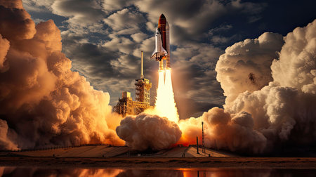 A space shuttle is depicted ascending into the sky, propelled by flames and smoke. The composition features the launch vehicle amidst a backdrop of clouds, with a support structure visible. The image uses a realistic style with detailed textures and lighting, possibly suitable for scientific, educational, or commercial applications.