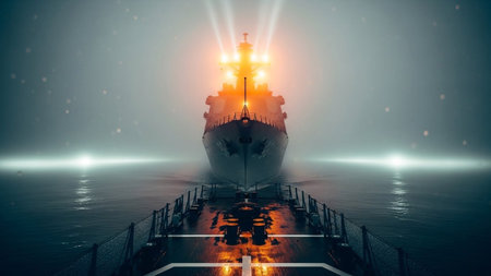 A powerful naval warship is depicted sailing directly towards the viewer through a thick, atmospheric fog. Intense orange spotlights from the ship cut through the mist, illuminating the dark, slightly choppy sea. The perspective is from another vessel, looking up at the imposing front of the warship. The scene is dramatic and moody, with subtle hints of rain or spray on the deck in the foreground, creating a sense of an intense and possibly ominous journey.