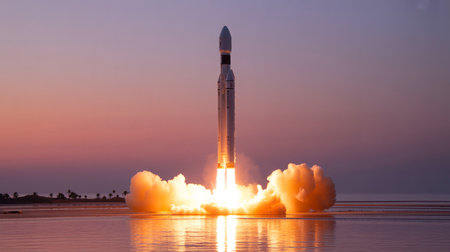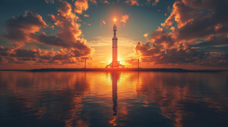 Powerful rocket launch ascending into the sky during a vibrant sunset with reflection on the water surface.