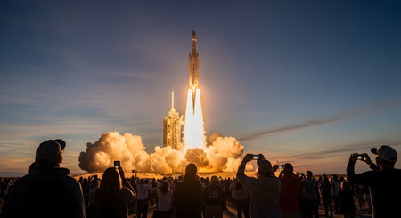 A massive rocket blasts off from a launchpad at dusk, its powerful engines creating a brilliant blaze of light and a huge plume of smoke. In the foreground, a large crowd of silhouetted spectators watches in awe, capturing the historic moment on their phones.