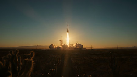 Witness a powerful rocket launch from a desert landscape. The space vehicle ascends amidst smoke and fire, reaching for the stars in a dramatic display of technology and human exploration. A magnificent journey into the unknown begins.