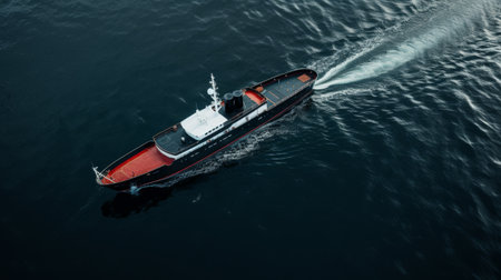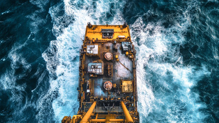 High-resolution image of a cargo ship sailing on the open sea, showcasing the ship massive size and its wake cutting through the water.