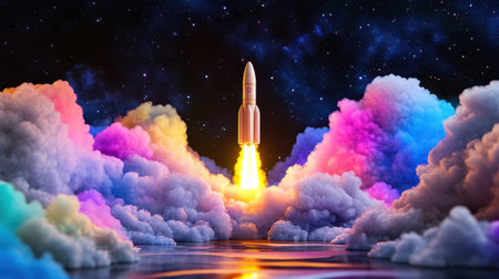 Colorful rocket igniting the sky at night, surrounded by stars and artistic swirls of luminous clouds below.