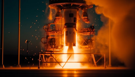 From a distance, a missile shoots. The night sky glows from the fire. It shows how humans can make amazing and dangerous things. AI generated