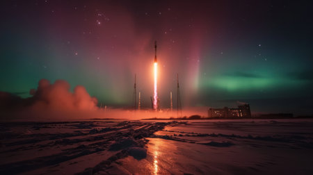 Sleek rocket launch against aurora borealis, 2100s skyline silhouette, lowangle, dusk light , photographic style