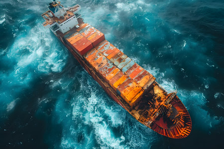This stunning aerial image captures a cargo ship navigating through turbulent ocean waters, showcasing the power and scale of maritime transport.