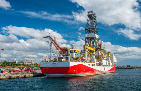 ISTANBUL, TURKEY - SEPTEMBER 4, 2021: YAVUZ Turkish Drillship mooring on Haydarpasa Port. Yavuz ship is owned by Turkish Petroleum Corporation (TPAO). Istanbul Turkey.