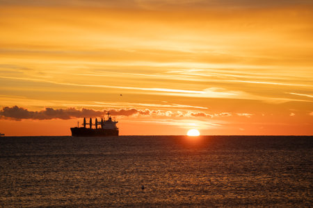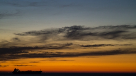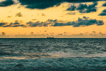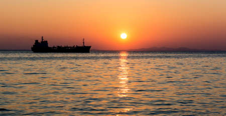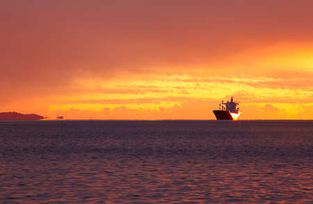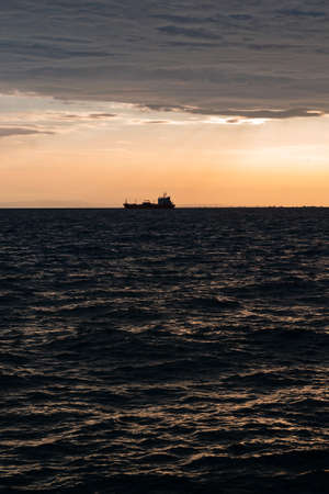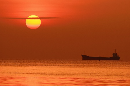 The silhouette of the merchant ship on the horizon, going into the sunset.