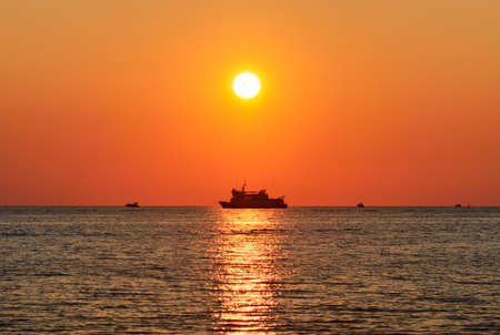 The big boat on sea at sunset time, silhouette