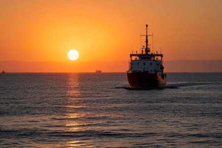 A cargo ship on the sea at sunset