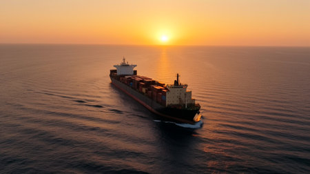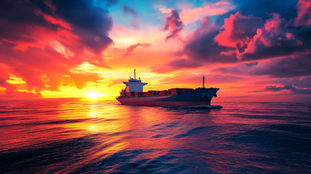 A massive container ship sails into the sunset, carrying goods across the ocean. AI Generative