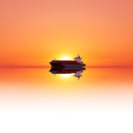 Stunning sunset view showcases a cargo ship silhouetted against vibrant colors in the sky, reflecting beautifully on the calm water, evoking peace and tranquility.