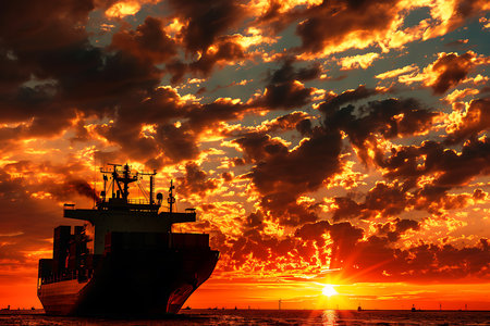 A cargo ship silhouetted against a dramatic sunset, highlighting a vivid orange sky filled with swirling clouds and the sun setting directly on the horizon.