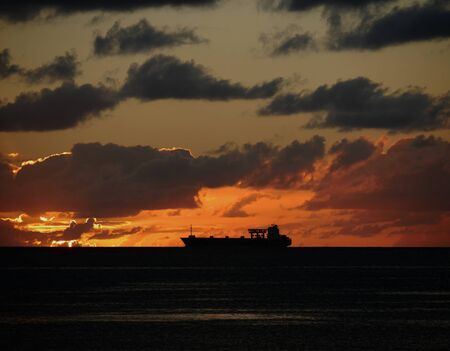 Oil tankers ship at sea on a background of sunset sky. Oil tankers in the ocean. Early in the morning, the sunrise sky. South Africa. Mossel Bay