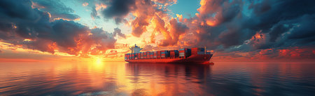 Cargo Ship at Sea with Dramatic Sunset Sky, International Shipping and Logistics Theme.