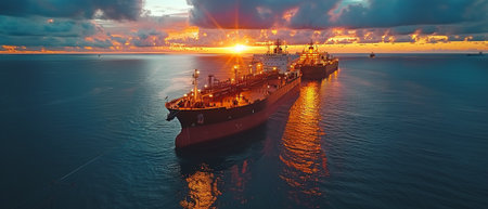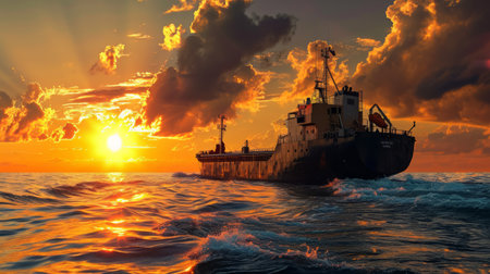 View of Big oil tanker is sailing in the ocean at sunset. The sky is filled with clouds and the sun is setting, creating a beautiful and serene atmosphere