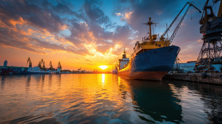 A striking cargo ship floats serenely on the water as the sun sets, casting warm hues across the sky and creating a reflective surface, symbolizing maritime industry.