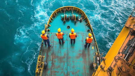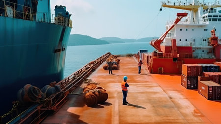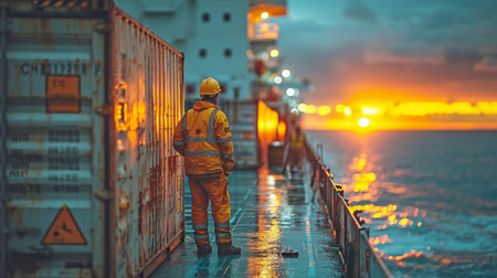 Close-up of workers loading containers, realistic details, ship's deck, vast ocean backdrop, photorealistic depiction Generative AI