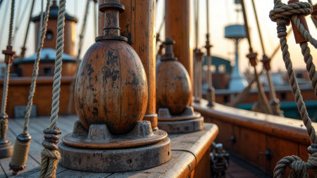 Close-up of wooden sailboat details in harbor at sunset. That the image is generated using AI.