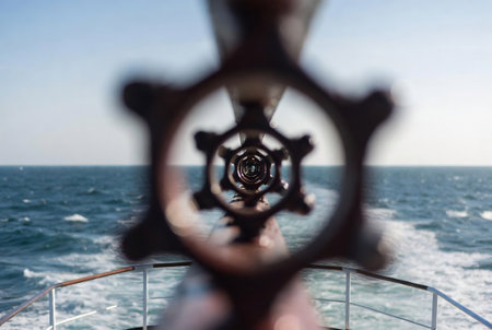 A wooden ship's wheel sits prominently on the deck of a vessel, set against a vast expanse of ocean. The image captures the movement of the water and the sky above, with muted tones and soft lighting. Suitable for travel themes, maritime projects, or illustrating navigation concepts.