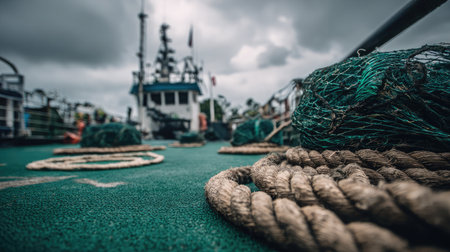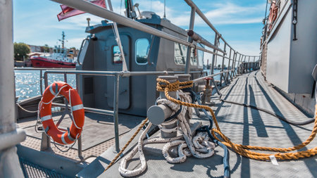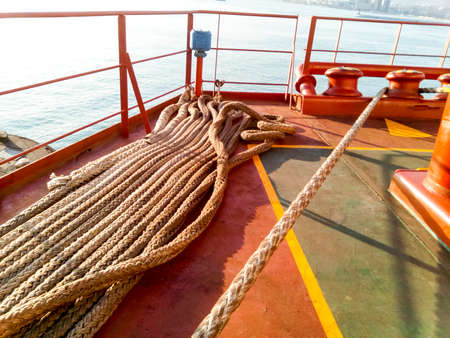 Thick marine rope on wooden pier in harbor, symbolizing strength, shipping industry, and maritime safety.