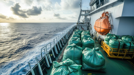 A serene view of cargo bags secured on a ship deck, with a breathtaking sunrise illuminating the ocean horizon, symbolizing maritime logistics and transportation.