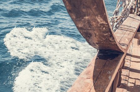 View from the ship on the sea foam and departing from the old wooden ship waves