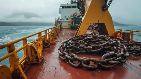 Heavy iron chains coiled on the deck of a ship with water in the background.