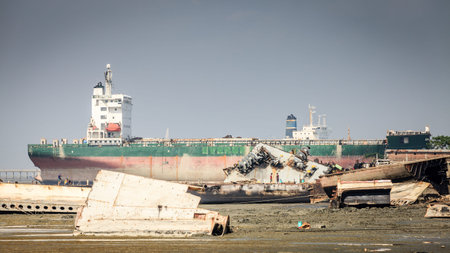 Chittagong, Bangladesh, December 23, 2017: Old ships are being dismantled at ship-breaking yards in Chittagong, Bangladesh