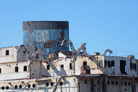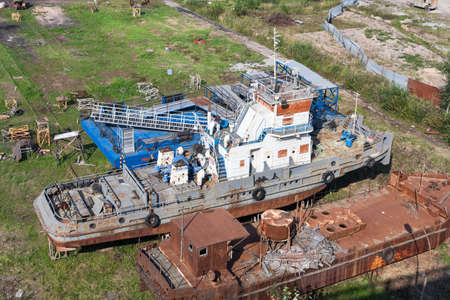 Obsolete and rusty vessel is in ship breaking yard ready for dismantling for metal