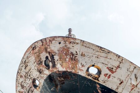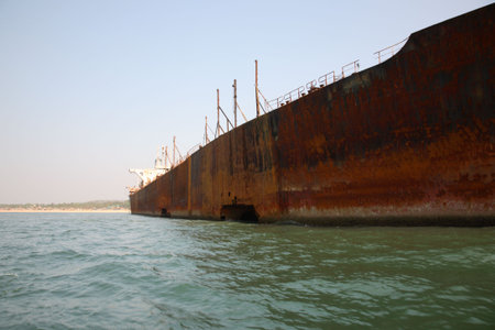 After a severe storm, the tanker was shipwrecked on the popular beach of Odessa, Ukraine. The ship lies on its side directly on the breakwater. Close-up dramatic photo.