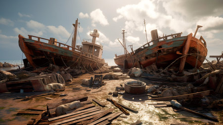 Rusty abandoned fishermen boats on shore, AI generative industrial landscape