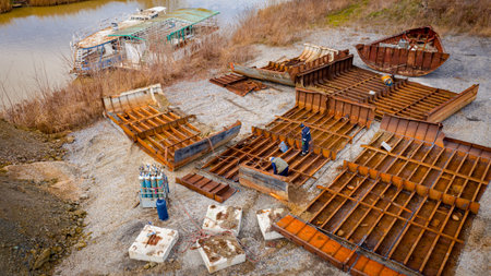 Aerial view of floating cargo transportation by construction materials transported building pipes and metal structures on barges