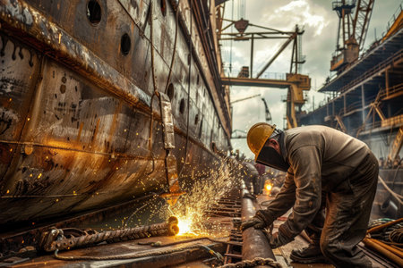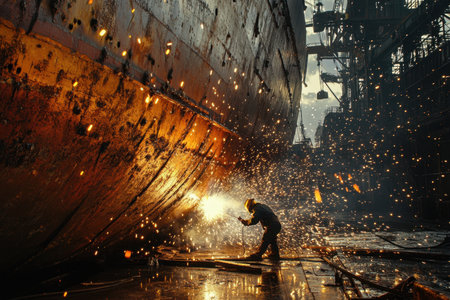 A laborer performing metal welding on a large ship's hull in a vibrant shipyard, surrounded by flying sparks and dramatic lighting, showcasing industrial craftsmanship.