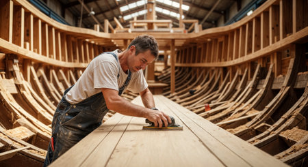 Master craftsman working on wooden vessel construction in boatyard. Perfect for maritime industry, craftsmanship, and traditional skills content.