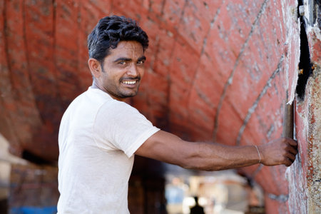 Chittagong, Bangladesh, December 22, 2017: Man is woring on a traditional fishing boat at a shipyard by the Karnaphuli River near Chittagong, Bangladesh