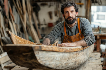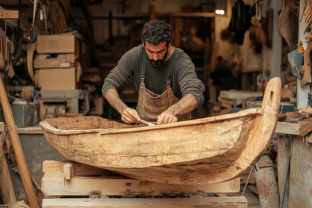 Shipbuilder crafting a wooden boat in a traditional workshop