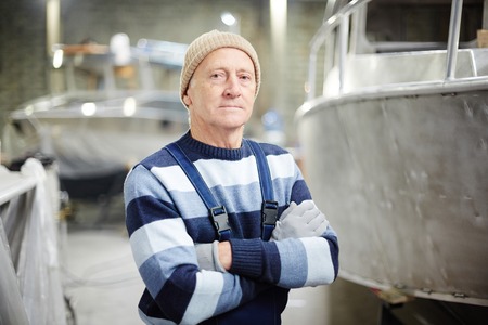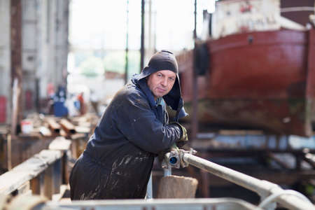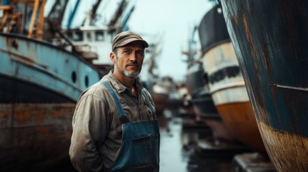 Experienced Fisherman Standing in a Boatyard with Old Fishing Vessels in the Background. High quality photo