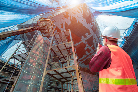 Industrial workers are working in a shipyard. Industry and engineering concept.