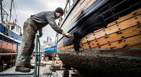 A man in work clothes stands on scaffolding in a shipyard, using a large brush to paint black sealant onto the barnacle-covered wooden hull of a fishing boat. This manual labor is part of the boat's maintenance and repair process in dry dock.
