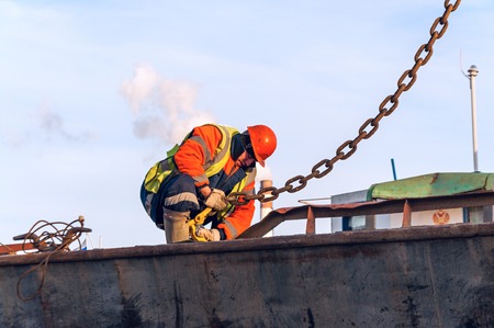 Seaman AB or Bosun on deck of vessel or ship , wearing PPE