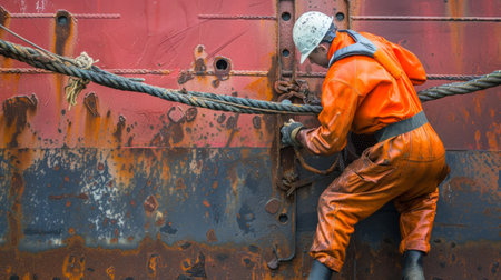 Dockworker wearing orange overalls and safety helmet securing cargo ship with heavy ropes in a port