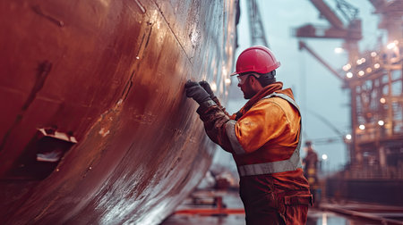 A shipyard worker in a safety uniform and helmet performing maintenance on a large vessel, with safety protocols in place.