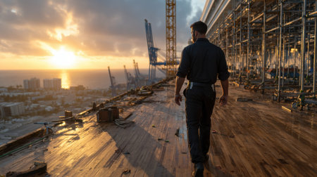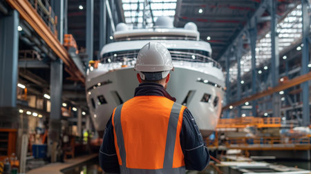 A construction supervisor wearing a hard hat, inspecting a nearly completed yacht, with his back facing the camera in an industrial shipyard setting