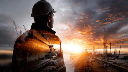 A vigilant construction professional gazes over a bustling harbor scene bathed in twilight, with rain-slicked surfaces reflecting vibrant industrial a