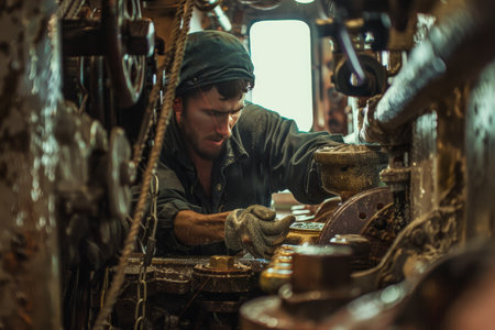 A boat repairman fixing a boat engine showcasing marine repair skills in a photo realistic style