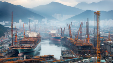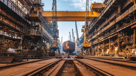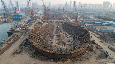 A vibrant industrial shipyard scene showcases a large vessel under construction, with towering cranes and heavy machinery lining the area. The well-organized environment highlights the intricate details of shipbuilding and engineering.