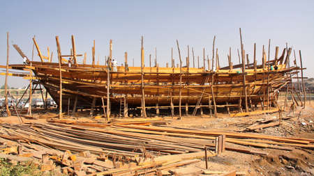 MANDVI, GUJARAT, INDIA - DECEMBER 21, 2013: Traditional wooden Dhow building