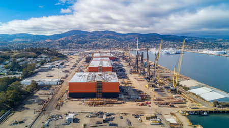 An expansive aerial view of a bustling shipyard features large cranes, a prominent ship under construction, and an array of industrial equipment against a vibrant sky.